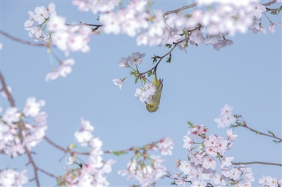 西湖平湖秋月旁,樱花盛开,一只绣眼在吸食花蜜。