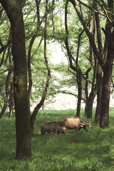 富阳桐洲岛绿光森林里,牛妈妈带着小牛在吃草。