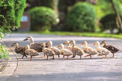 西湖边,鸭妈妈带着10只小鸭在水中和岸上觅食。