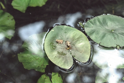 茅家埠,两只小青蛙在睡莲叶上休息。