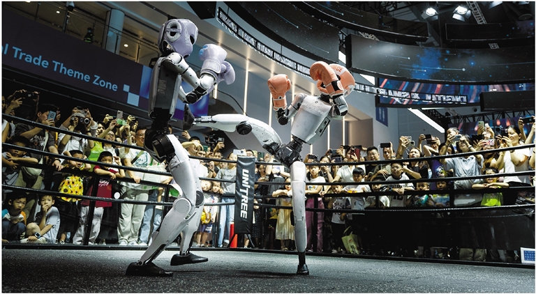 2025年9月27日,下午4点,杭州大会展中心,第四届全球数字贸易博览会杭州六小龙展区,演示舞台被兴奋的观众围得水泄不通。两台身高约1.3米的人形机器人,将好莱坞科幻电影《铁甲钢拳》中的动作名场面“复刻”,拳打脚踢。