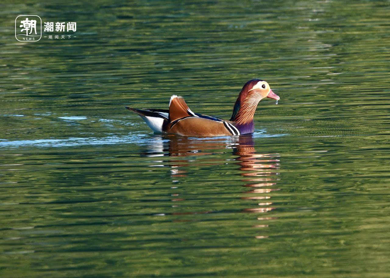 一只雄鸳鸯在晨光中游弋。记者 杨晓轩 摄