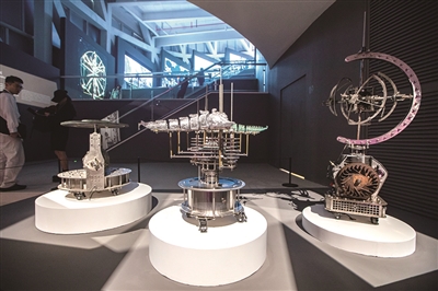 本次展览地点位于玉湖公园内的余杭美术馆,馆身设计以双环同构的良渚圆璧为灵感,营造出“悬浮”于天地之间的意象。整个展厅空间以110余件(组)艺术作品构建了一座文明的山峰,需要沿着曲折的台阶一路向上,看展的过程本身也像是一次攀登和探索,通过不同纬度、不同路径的攀登,最终在人文与科技交汇的顶峰展开对话。