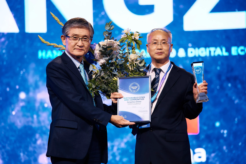 活动上,诺贝尔和平奖获得者、现任联合国秘书长顾问、全球能源奖国际委员会主席郑来权为杭州颁发可持续发展城市与社区奖。