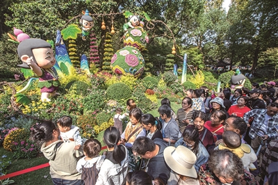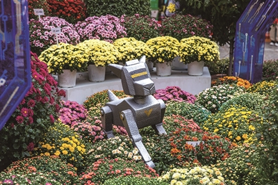 往里走,一共有15组菊花艺术小品散布在杭州植物园各处。比如,玉泉鱼跃景区门口的《花满杭城路·数字绽芳华》,通过三层空间布局,将无人机花瀑、互动机器狗与菊花结合,展现科技与浪漫的碰撞。还有主展区里人气超高的一组萌趣“葫芦娃”,名为《葫芦童忆》,以菊花为肌、藤蔓为骨,将经典的葫芦娃形象融入创作,现场还有《葫芦娃》动画片的背景音乐循环播放,唤醒童年回忆。