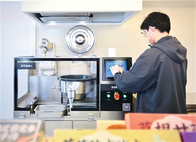 炒菜机器人“上班”后,后厨的人轻松了不少。食堂负责人算了笔账:两台机器人花了15万元。以前,每餐要炒30多道菜,得3个厨师忙前忙后;现在,一位厨师就能同时操作两台机器。