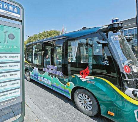 近日,三辆自动驾驶的小型巴士在滨江白马湖区域投入运营,乘客不用刷卡、无需投币,就可免费乘坐。