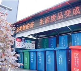 小区垃圾收集站里,灰、绿、蓝、红四色桶对应四种垃圾。其中,蓝桶负责装的是“可回收物”。