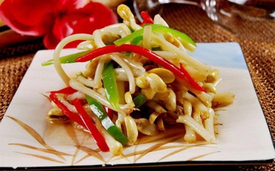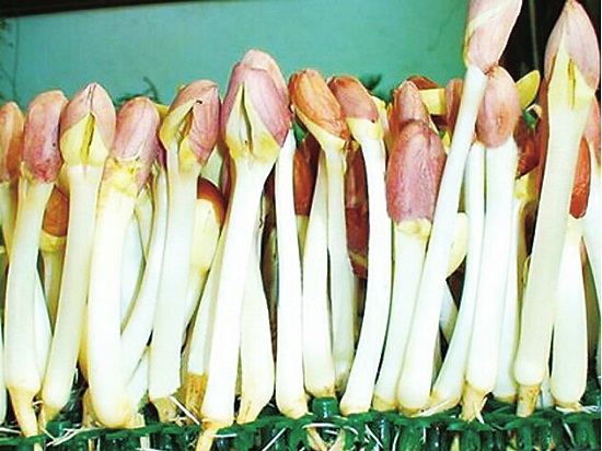 朋友聚会,在餐桌上看到一盘像黄豆芽炒肉的菜,但比黄豆芽看起来根茎粗壮一倍而且颜色发白,当试着夹一筷品尝,入口芽根细嫩,豆荚瓣脆爽,整个菜的味道是清脆爽口、满嘴鲜香,美味极了。就餐完毕,我特意跑到后厨,请教了厨师,问这道菜是什么菜,厨师说是花生芽炒肉,这是今年刚流行在餐桌上的一道新菜品,一经推出,赞誉不断,受到很多顾客青睐。