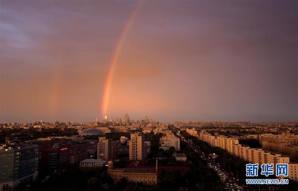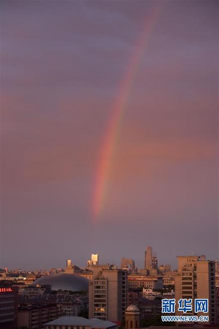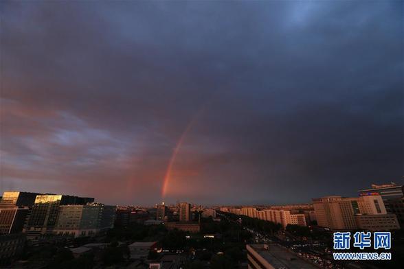 5月23日,北京市区迎来降雨天气,雨后出现彩虹景观。这是在宣武门附近拍摄的彩虹。 新华社记者邢广利 摄