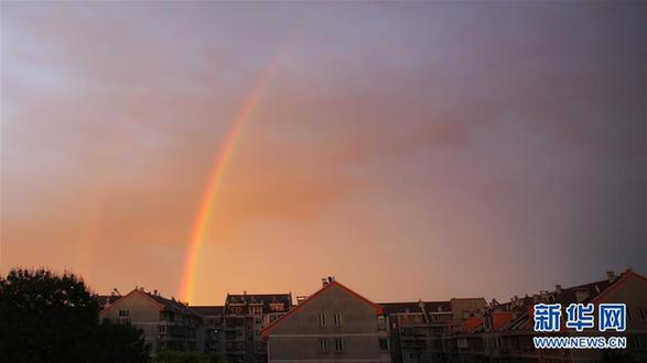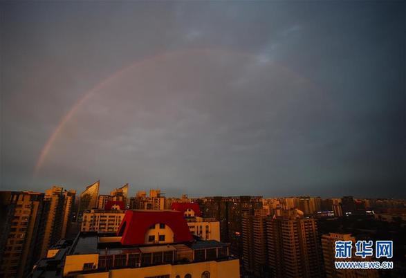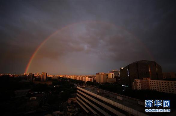 5月23日,北京市区迎来降雨天气,雨后出现彩虹景观。 新华社记者吴凯翔 摄