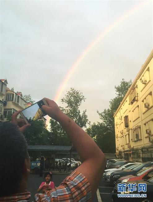 5月23日,北京市区迎来降雨天气,雨后出现彩虹景观。这是居民在海淀区一小区内用手机拍摄彩虹(手机拍摄)。 新华社记者陈建力摄