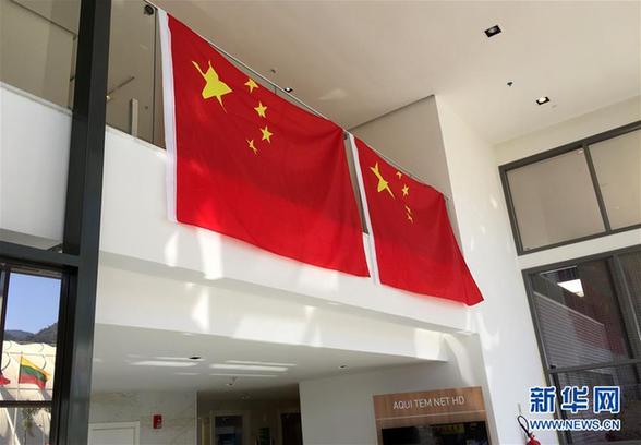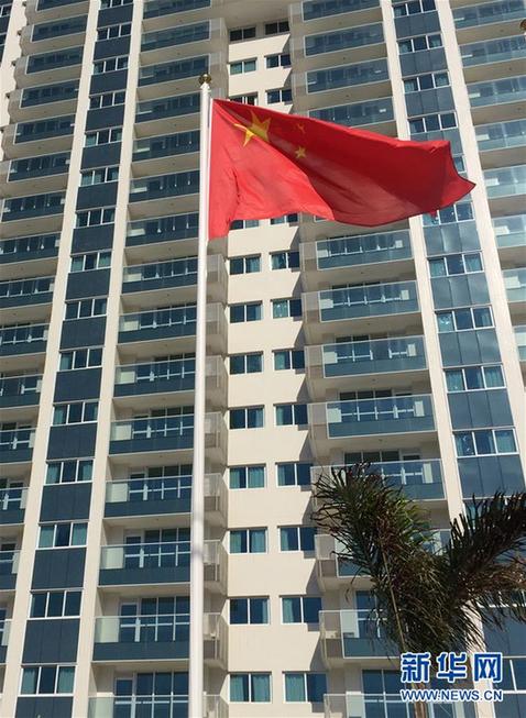 7月24日,中国代表团居住的大楼内悬挂着中国国旗。当日,里约奥运会奥运村开村仪式在巴西里约热内卢举行。目前,中国代表团团部和部分选手已经入住奥运村。新华社记者姬烨摄