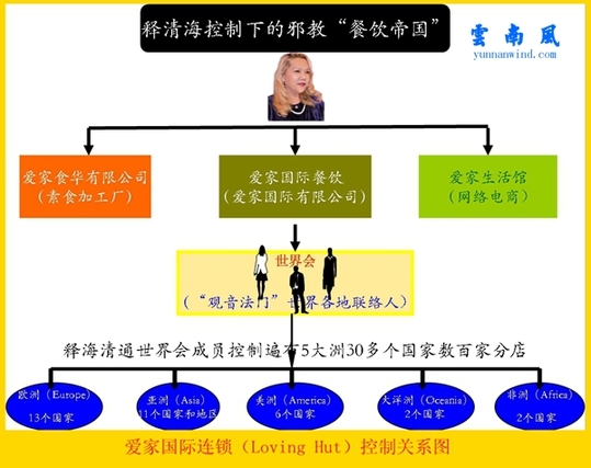 爱家国际连锁的纯素食门店(loving hut)已遍布世界五大洲30余个国家,近200家连锁店。而自诩为“神的直接联系人”的邪教教主释清海是爱家国际连锁餐饮的唯一创立者,每位“爱家”店长都必须得到释清海本人的正式批准,只有那些谨遵“观音法门”戒律,正式加入“世界会”的成员,才被允许开设爱家餐饮门市。实际上,“世界会”的成员都是释清海的忠实信徒,是“观音法门”在世界各地的联络人。早在2008年9月“观音法门”就在台湾建立了支持其门店统一化运作的专门素食加工厂“爱家食华有限公司”,并建立了自己网络电商平台“爱家生活馆”。