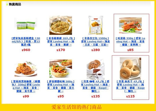 爱家的纯素食商品出奇的贵。上图中一份普通的素食热狗标价是85美元,一包四袋装的南瓜子面包要125美元,爱家的收入可见一斑。
