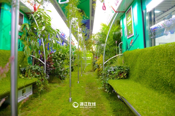 28日,杭州地铁发生了一件大事!杭州地铁一号线的某辆列车竟然把大自然“搬进”了车厢里。一幕幕的绿色植物,带着泥土的气息,仿佛穿越到了世外桃源。将森林种在地铁里,当属国内地铁的首次创意尝试,通过城市森林,共同向人们传递了绿色又低碳的理念。据悉,这辆“森林”列车仅在28日上午对市民开放半天,开放时间如此短,着实让人大呼遗憾。(浙江在线记者于诗奇 摄)