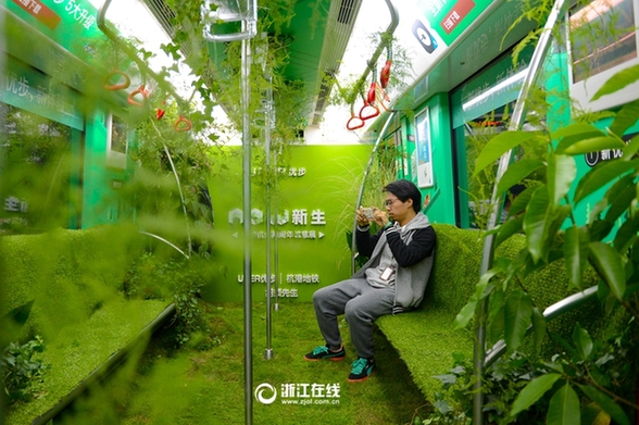 28日,杭州地铁发生了一件大事!杭州地铁一号线的某辆列车竟然把大自然“搬进”了车厢里。一幕幕的绿色植物,带着泥土的气息,仿佛穿越到了世外桃源。将森林种在地铁里,当属国内地铁的首次创意尝试,通过城市森林,共同向人们传递了绿色又低碳的理念。据悉,这辆“森林”列车仅在28日上午对市民开放半天,开放时间如此短,着实让人大呼遗憾。(浙江在线记者于诗奇 摄)