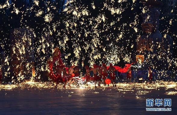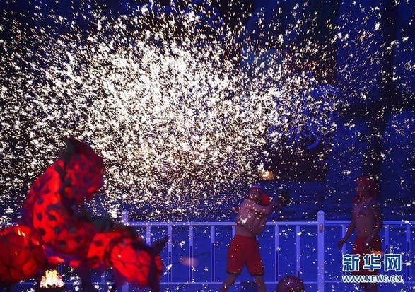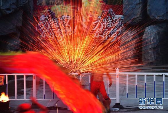 李廷刚的表演队在沈阳方特欢乐世界神秘河谷广场表演“火龙钢花”(5月30日摄)。