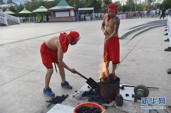 6月17日,在沈阳方特欢乐世界神秘河谷广场,李朝中(左)将钢花拍打至空中。新华社发(龙雷摄)