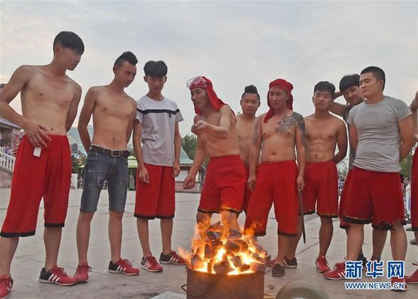 6月17日,在沈阳方特欢乐世界神秘河谷广场,李朝中(左四)向年轻队员讲解烧制铁水的技巧,右四为李廷刚。新华社发(龙雷摄)