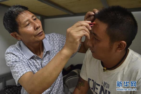 6月17日,李廷刚(右)在表演时额头被烫伤,父亲李朝中在表演结束后用碘伏为其伤口消毒。新华社发(龙雷摄)