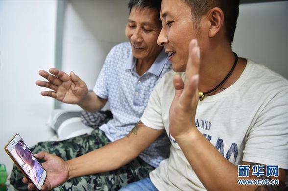 6月17日,结束一天的表演,李廷刚(右)回到宿舍与父亲一起跟女儿视频通话。新华社发(龙雷摄)