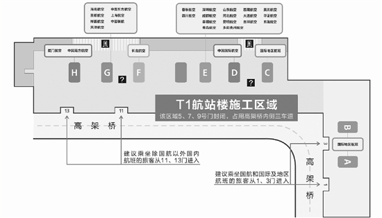 与此同时,T1航站楼的5、7、9三个门在施工期间也将封闭,大家要从出发层剩余的1、3、11、13的四个门进入。