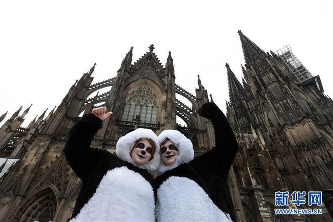 这是2017年2月27日,在德国科隆,“玫瑰星期一”大游行上装扮成熊猫的狂欢者经过科隆大教堂。