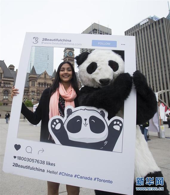 这是2017年5月19日,在加拿大多伦多市政广场,一名游客在中国旅游文化节上与熊猫人偶合影。主题为“熊猫走世界——美丽中国”的2017年加拿大中国旅游文化节当日在多伦多市政广场举行。