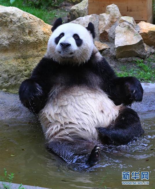 这是2017年5月30日在荷兰乌得勒支省雷嫩市的欧维汉兹动物园拍摄的大熊猫“星雅”。来自中国大熊猫保护研究中心的两只大熊猫“星雅”和“武雯”在度过一个多月的检疫期后,于当日首次与公众见面。