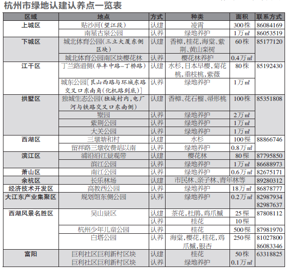 昨天,杭州市绿化办公布了今年城区绿地认建、认养情况,邀请市民一起植树。