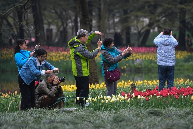 3月19日,市民和游客在太子湾公园观赏盛开的郁金香。