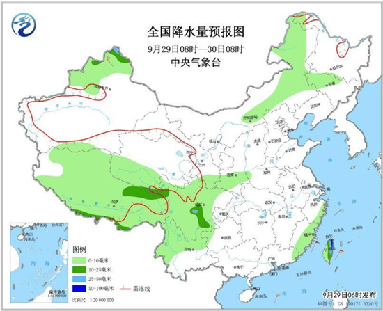 图2 全国降水量预报图(9月29日8时-30日8时)