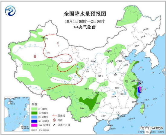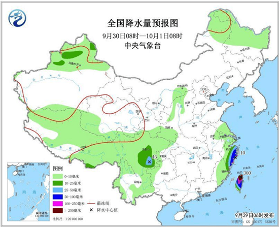 9月30日8时至10月1日8时,新疆伊犁河谷、北疆北部、西藏东南部、四川盆地西部、浙江东部沿海、台湾岛大部等地的部分地区有中到大雨,台湾岛中北部、浙江东南部沿海等地的部分地区有暴雨或大暴雨、局地特大暴雨(100~300毫米)。新疆沿天山地区和北疆东部等地的部分地区有5~7级风(见图3)。