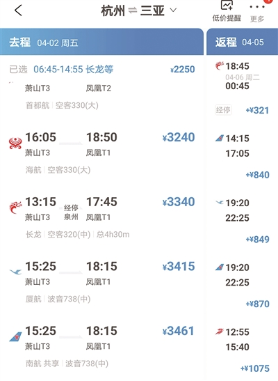 清明小长假,杭州飞三亚的机票价格涨至3200元起。机票价格实时变化,以上价格仅供参考,请以实时查询为准。
