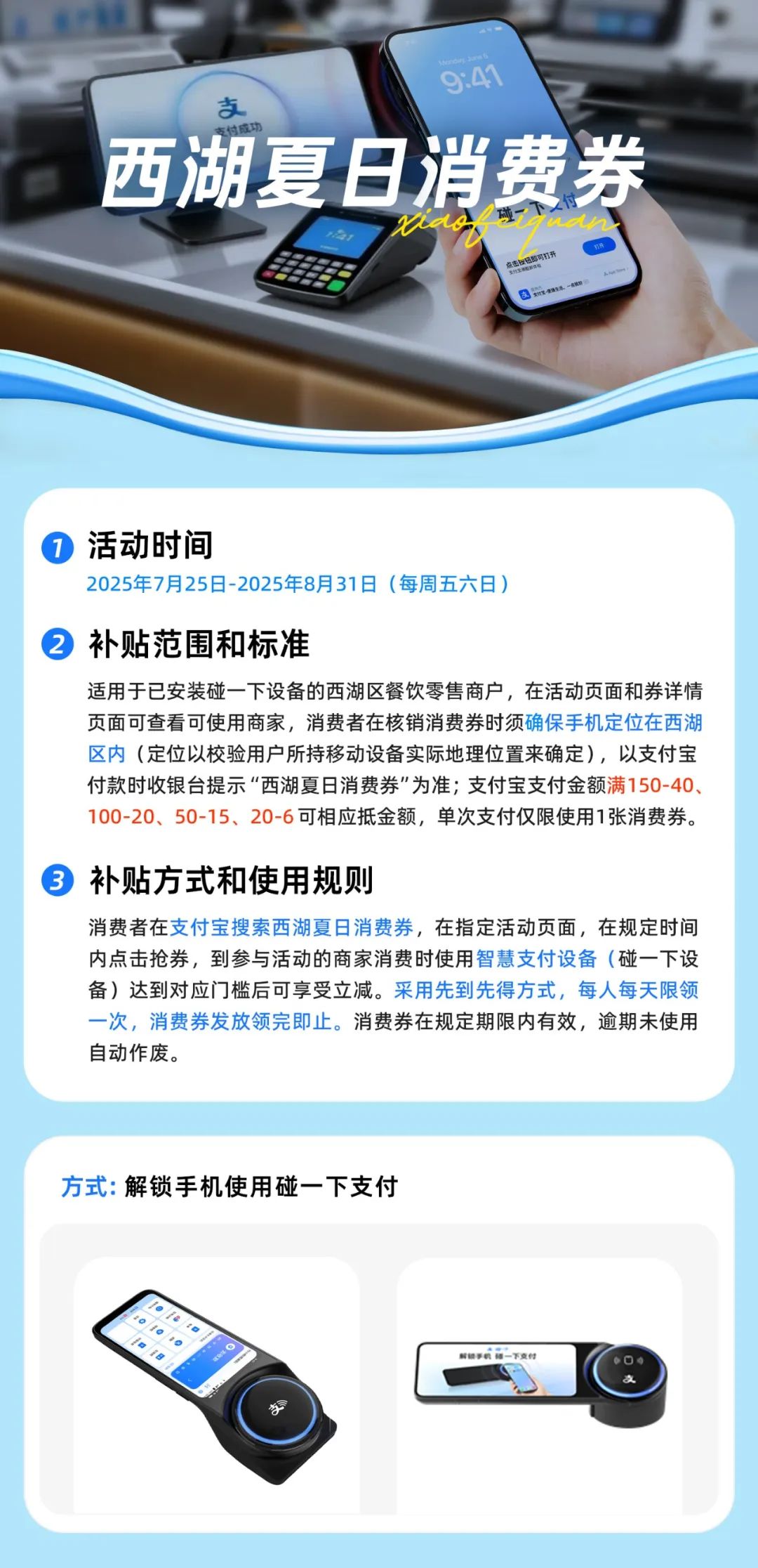 西湖夏日消费券来啦!7月25日起至8月31日期间,每个周五至周日,都可以前往支付宝领取,消费券的补贴范围和标准如何?使用时需要注意什么?一起来看↓↓↓