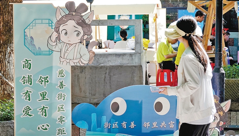 近日,上城区“善商聚·多彩行”街区慈善助力共富成果交流活动在清河坊历史街区举行,全区14个街道的公益格子铺齐聚鼓楼小广场开展微服务,首批80家商户签约共建“善立方”,共同见证上城区首条慈善街区项目的正式启动。近年来,上城区以“善立方”为载体,积极探索慈善创新路径,初步形成“一街多点、覆盖全域”的慈善服务网络。