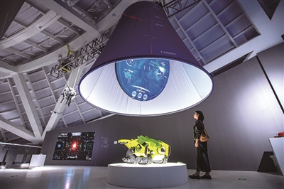 大家还能看到由中国美术学院创新设计学院与中国科学院创作的虚拟仿真交互装置《深海智能无人潜航器》,深海智能无人潜航器是一种集机动性、多功能与广阔机动范围于一体的深海科学考察智能装备,这个装置生动展现了未来深海科考工作场景与深海科学的独特魅力。