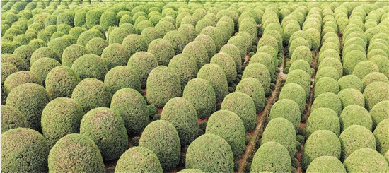 近日,杭州余杭区桂博园内8000余棵桂花树即将迎来绽放期,包含丹桂、金桂、银桂等品种,其中丹桂因色泽艳丽被游客称为“肉松球”。天气转凉后,桂花进入最佳修剪期,工人登上高梯,修剪出球形桂花树。