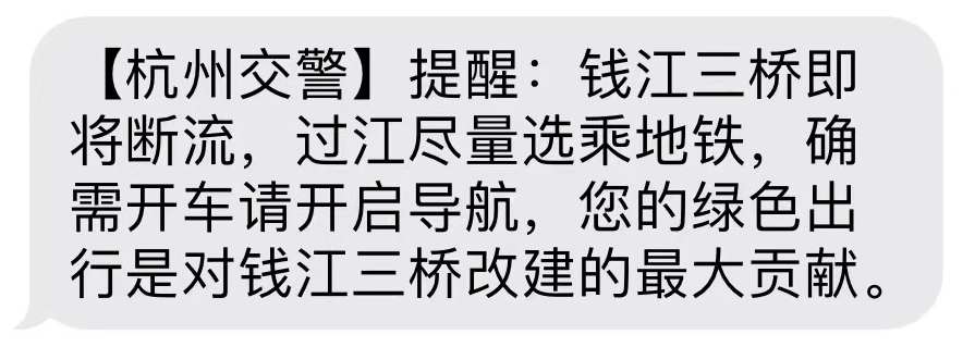 昨天中午,家住滨江的程先生收到了来自于杭州交警的提醒:钱江三桥即将断流,过江尽量选乘地铁,确需开车请开启导航,您的绿色出行是对钱江三桥改建的最大贡献。