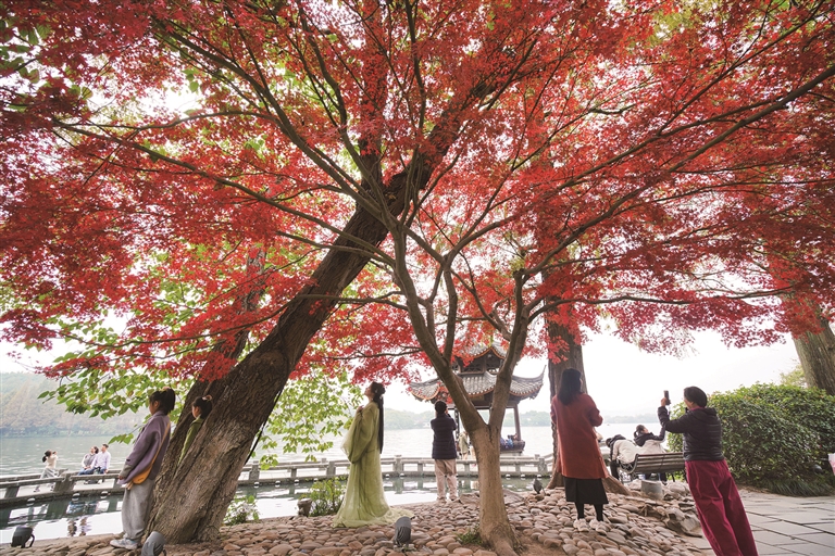近日,杭州长桥公园的夕影亭旁,有一棵枫树率先变红了。这棵红枫离西湖特别近,它对着夕影亭和雷峰塔,抬眼望去,红叶如焰,灿若流霞,形成初冬西湖边一道独特的风景线,吸引很多游客驻足拍照。