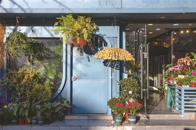 孩儿巷,花店门口挂着一把银杏叶雨伞。 记者 陈中秋 摄