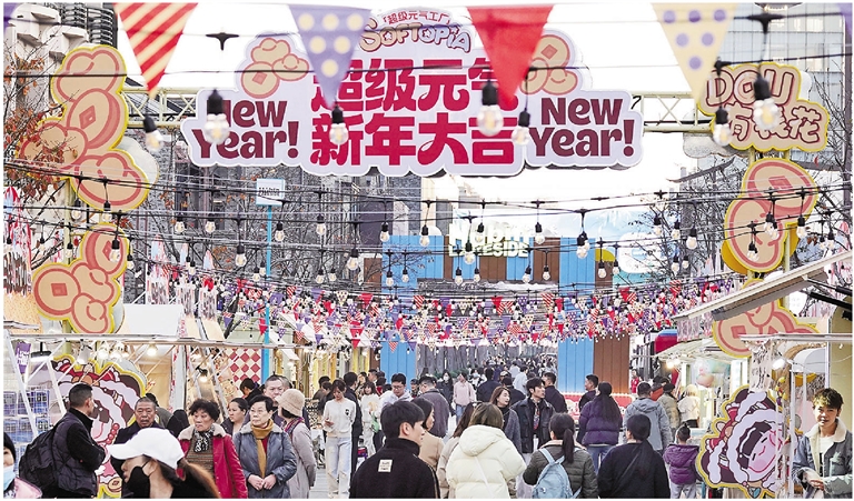 12月17日,2025年进入岁末倒计时,湖滨步行街的“超级元气”市集已换上了“新年大吉”的盛装,各种喜庆饰品、文创潮玩、特色美食等摊位一溜排开,营造起喜迎新年的浓浓氛围。