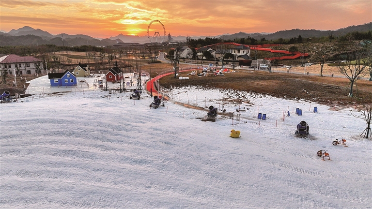 近日,位于临安区天目未来谷的日光雪谷开启试营业,标志着杭州首个以“北欧雪境”为主题的沉浸式嬉雪乐园正式亮相。园区规划面积约10万平方米,以“冰岛风”为设计蓝本,设置了极具北欧风格的小木屋,引进了诸多雪地萌宠,为市民游客带来一场集娱乐、互动、体验、打卡于一体的冰雪狂欢盛宴。图为昨天傍晚拍摄的日光雪谷。