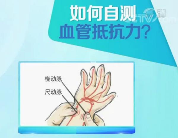2.自测血管抵抗力:握拳后用手指分别按压住手掌根部的桡动脉和尺动脉,然后伸开手掌,松开按压尺动脉的手指,继续保持压迫桡动脉,观察手掌颜色变化。