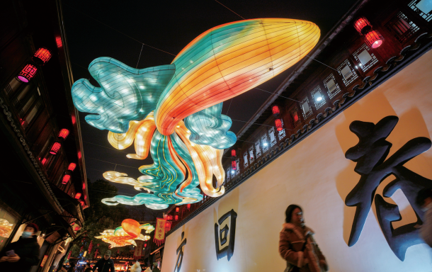 新春临近,杭城的年味越来越浓。去年刷爆杭州人朋友圈的拱宸桥C位鱼灯,今年以惊艳的鲲鹏造型再度回归。全新打造的《逍遥游》同款鲲鹏造型灯组,以“鲲鹏入梦”为主题,融合传统非遗技艺与现代光影艺术,在夜幕中展开流光溢彩的羽翼。灯组每天17:30亮起,位于拱墅区桥弄街方回春堂门前。图为昨晚桥弄街上美丽的“鲲鹏入梦”鱼灯。