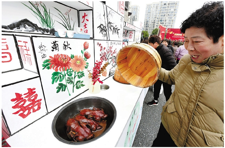 除了“大运河灶画”非遗代表性传承人胡永兴现场手写福字送祝福,21个特色摊位组成的大运河灶画非遗市集,更是藏满了舌尖与指尖的惊喜。软糯香甜的打糕冒着热气,糖葫芦、捏面人、吹糖人唤醒围观居民的童年记忆,而最让大家心心念念的,当数石塘特色蹄髈试吃活动。半山石塘特意准备了80只蹄髈,全部由本地村厨潘师傅用传统老灶慢炖,排队试吃的居民络绎不绝,一口下去满是鲜香,大家纷纷点赞这地道的家乡老味道。“这蹄髈肉太香了,我一连吃了2份,住在这里的居民,太有福气了。”来自东北的社区经营户小王姑娘一边大口吃着肉,一边高兴地说道。