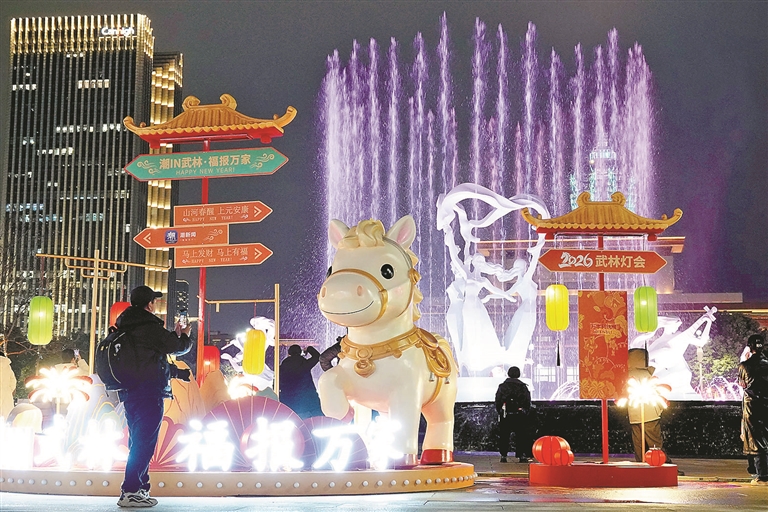 2月27日(正月十一)夜幕降临时,随着武林广场上一盏盏彩灯次第亮起,2026武林商圈元宵灯会正式拉开大幕。本次元宵灯会以“潮玩+民俗”为核心,联动武林商圈各大商场、社区及共建单位,以武林广场为起点,沿“杭州中轴线”延安路向南延伸,设置灯影长廊、祈福太平鼓、宋词灯牌、马年装置、特色市集、非遗展演、潮玩游戏等互动体验及打卡点,向市民游客展开一幅“古今交汇、潮起钱塘”的杭城盛景。
