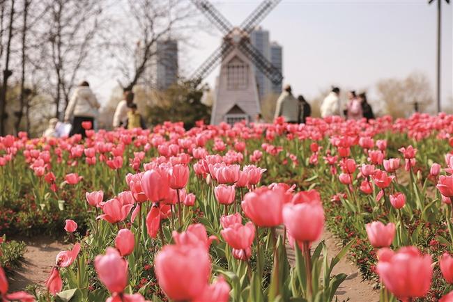 近日,南江公园郁金香迎来盛花期。红、粉、黄等各色郁金香连片绽放,亭亭玉立、色彩缤纷,宛如春日油画,吸引不少市民前来踏青赏花、拍照打卡。