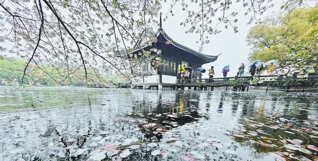 3月31日,曲院风荷内,伴随着春雨,樱花花瓣随风飘落在西湖水中,如同下了一场“花瓣雨”,吸引众多市民游客冒雨前来观赏、拍摄。市气象台预计,4月3日前后,杭州还将迎来一轮较为明显的阵雨、雷雨天气,正应了那句“清明时节雨纷纷”的经典诗句。